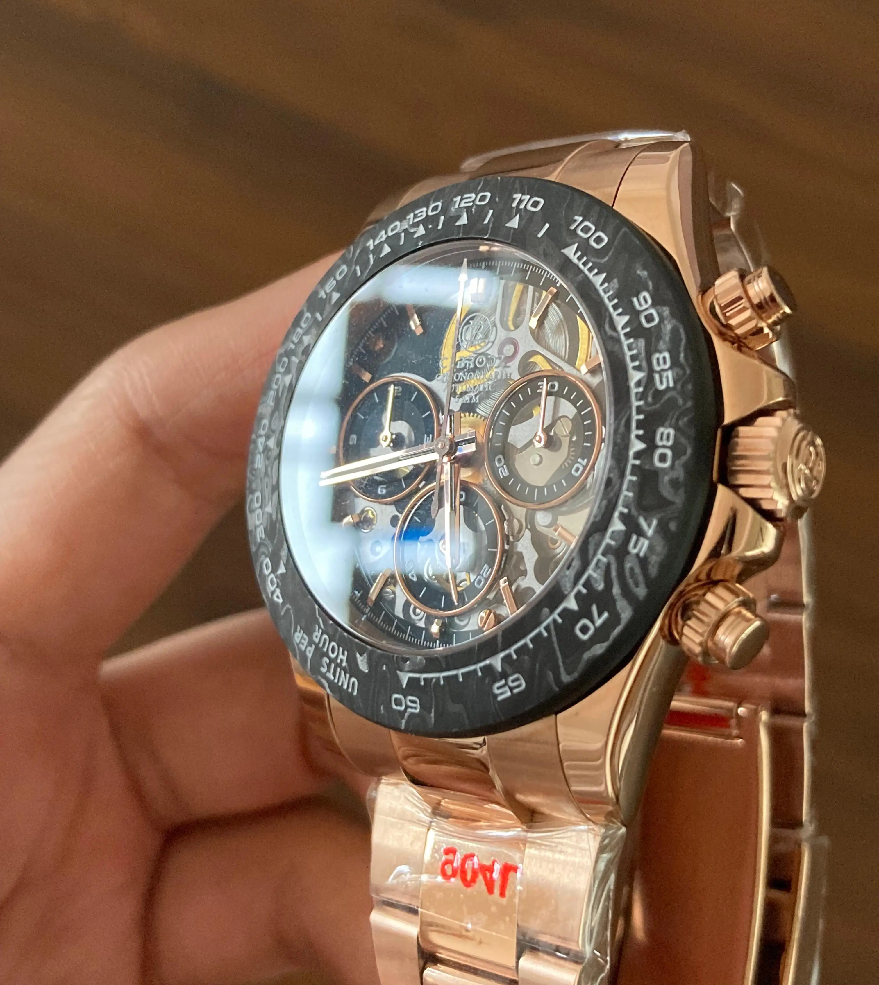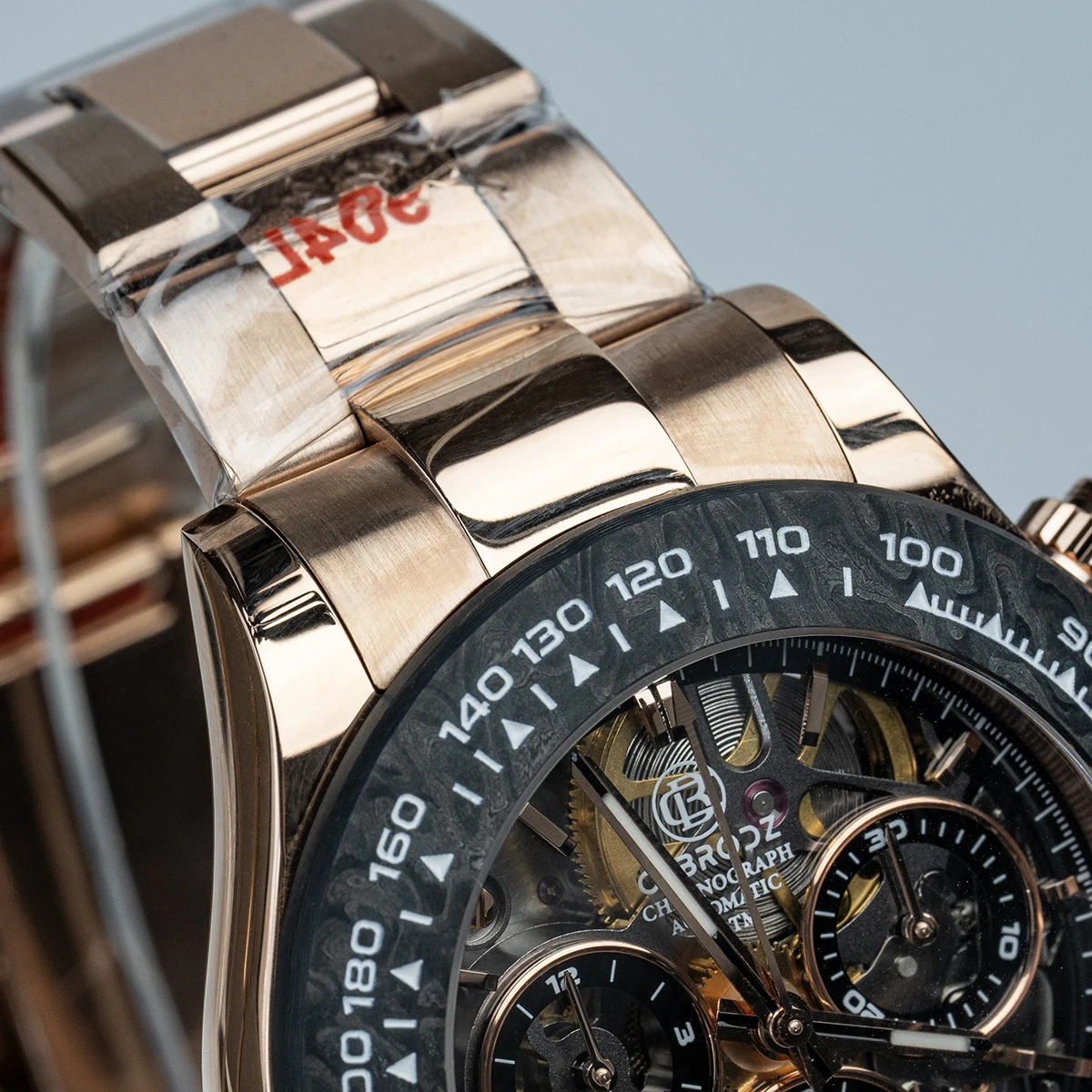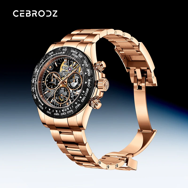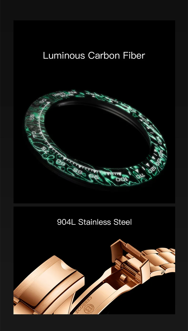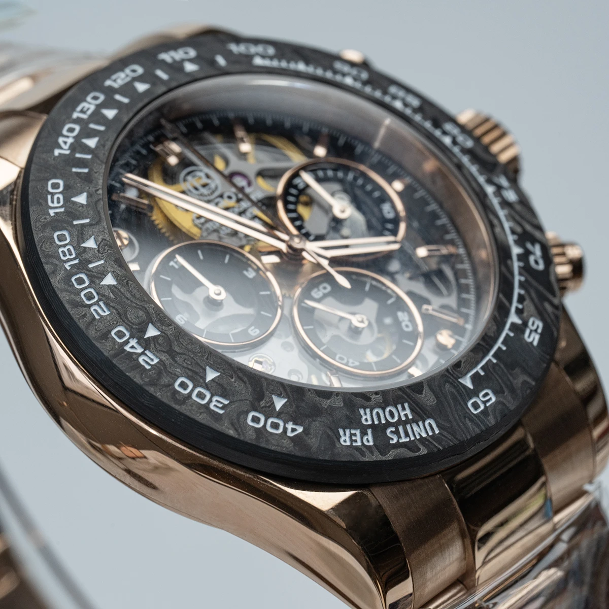 A new collision of legendary watches, showing the complex counting device at a glance, 904L stainless steel provides tough and reliable protection. The watch is equipped with a carbon fiber outer ring kit filled with luminous materials, PMMA micro-sand effect dial and PVD rose gold scale.