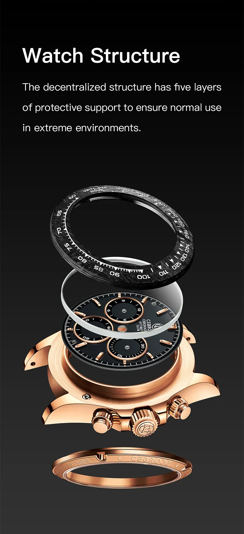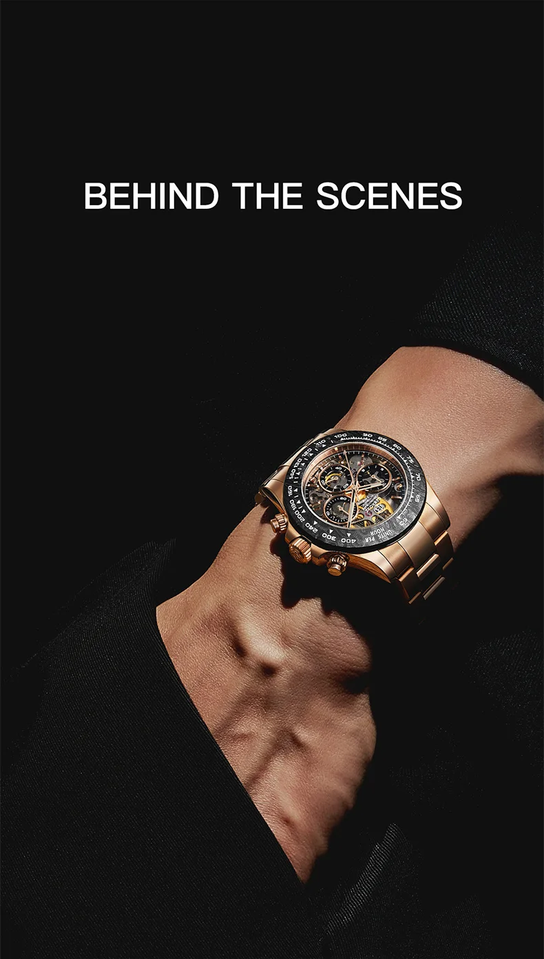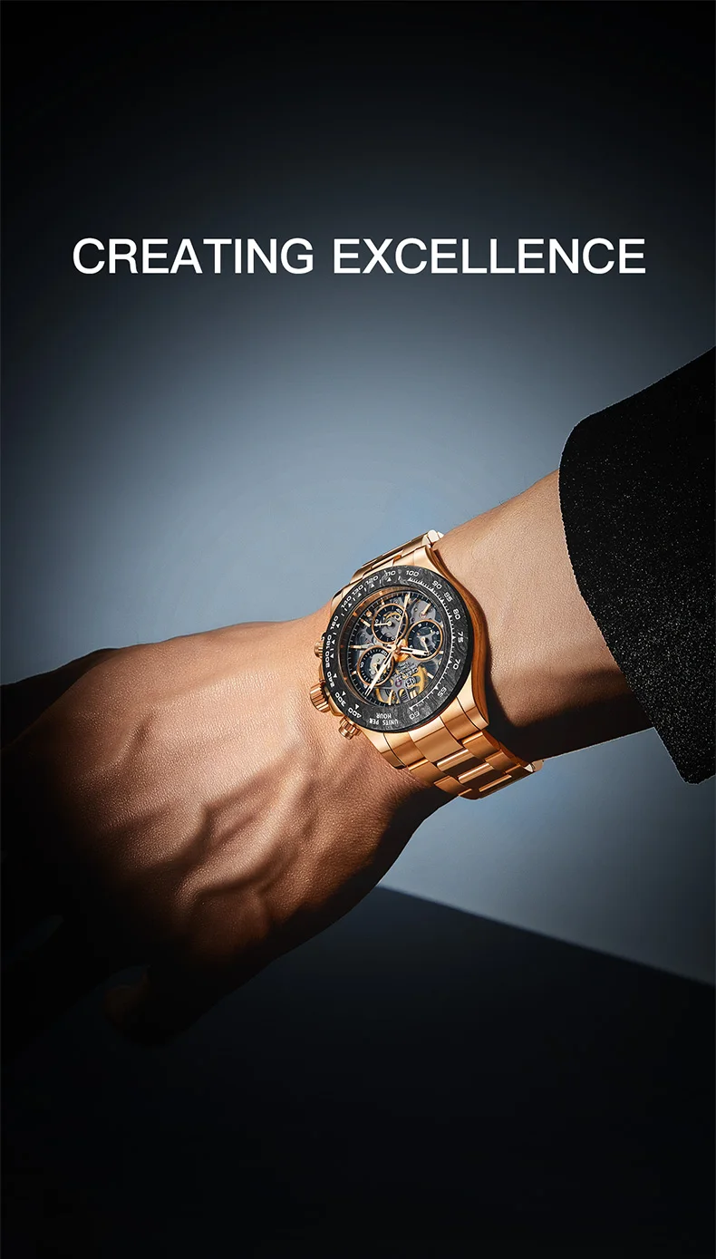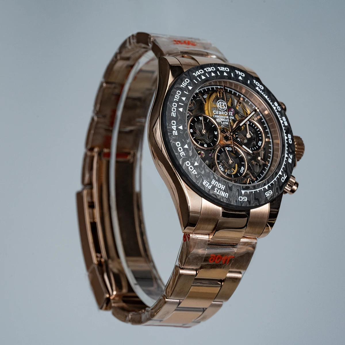A new collision of legendary watches, showing the complex counting device at a glance, 904L stainless steel provides tough and reliable protection. The watch is equipped with a carbon fiber outer ring kit filled with luminous materials, PMMA micro-sand effect dial and PVD rose gold scale.