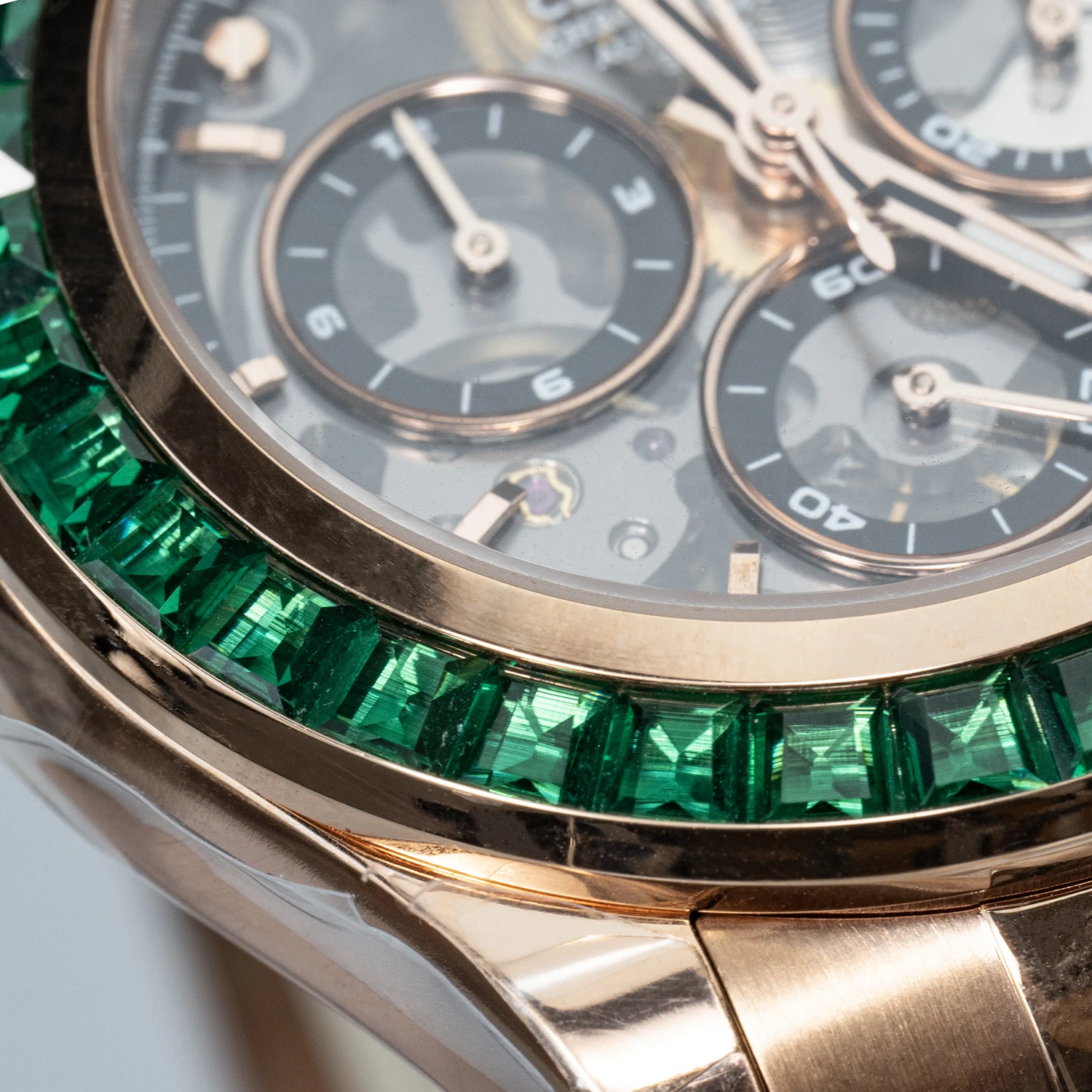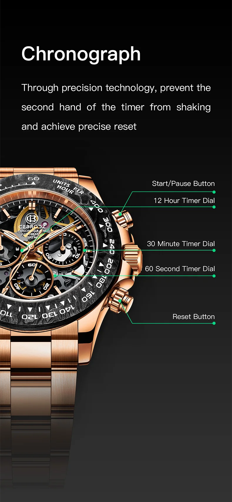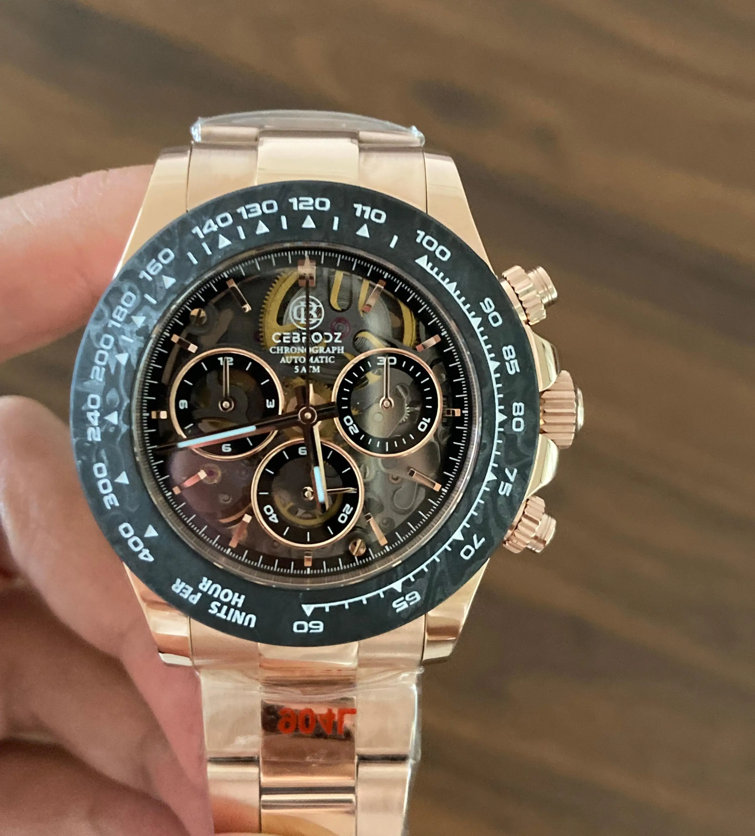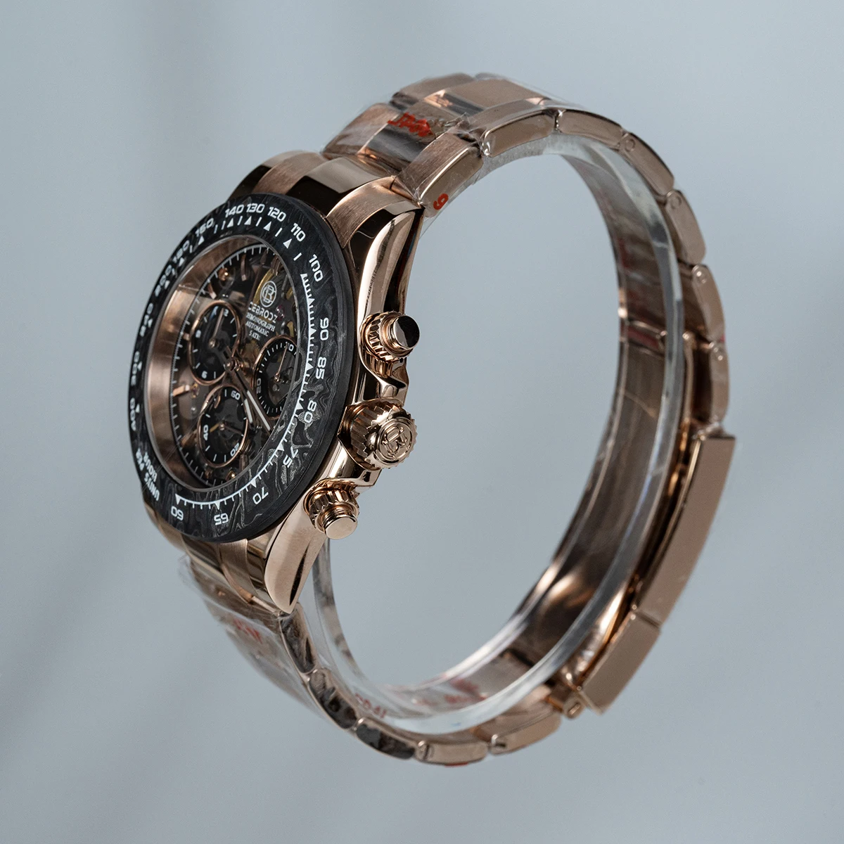 A new collision of legendary watches, showing the complex counting device at a glance, 904L stainless steel provides tough and reliable protection. The watch is equipped with a carbon fiber outer ring kit filled with luminous materials, PMMA micro-sand effect dial and PVD rose gold scale.