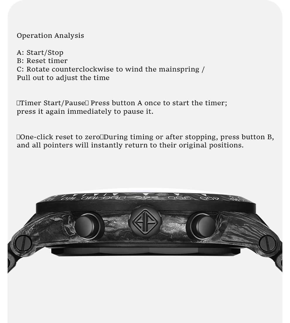 【Start/Pause Chronograph】Press button A to start the stopwatch; press again to pause.