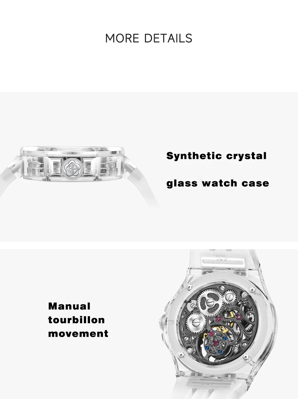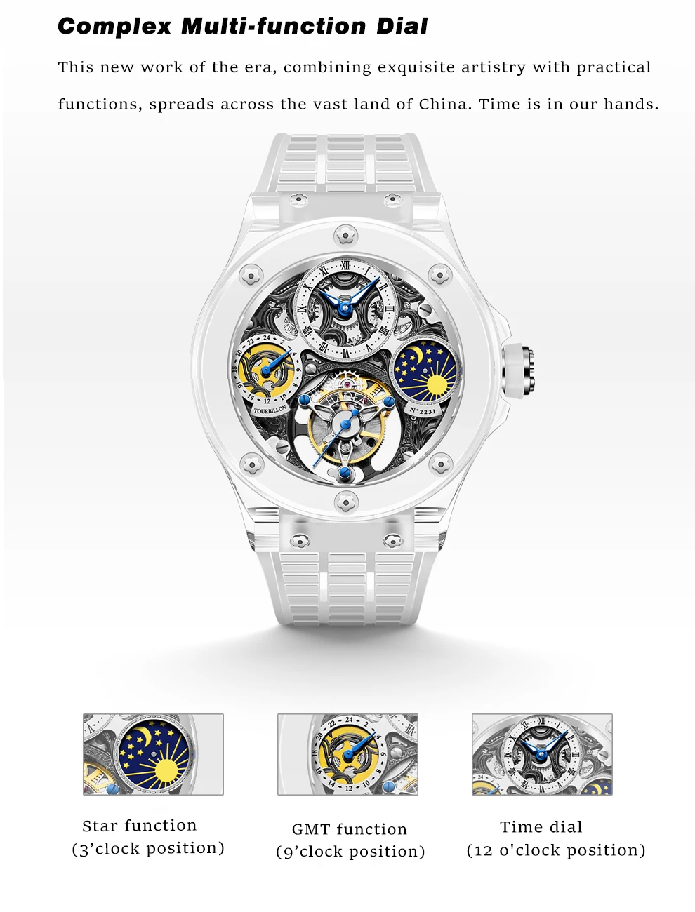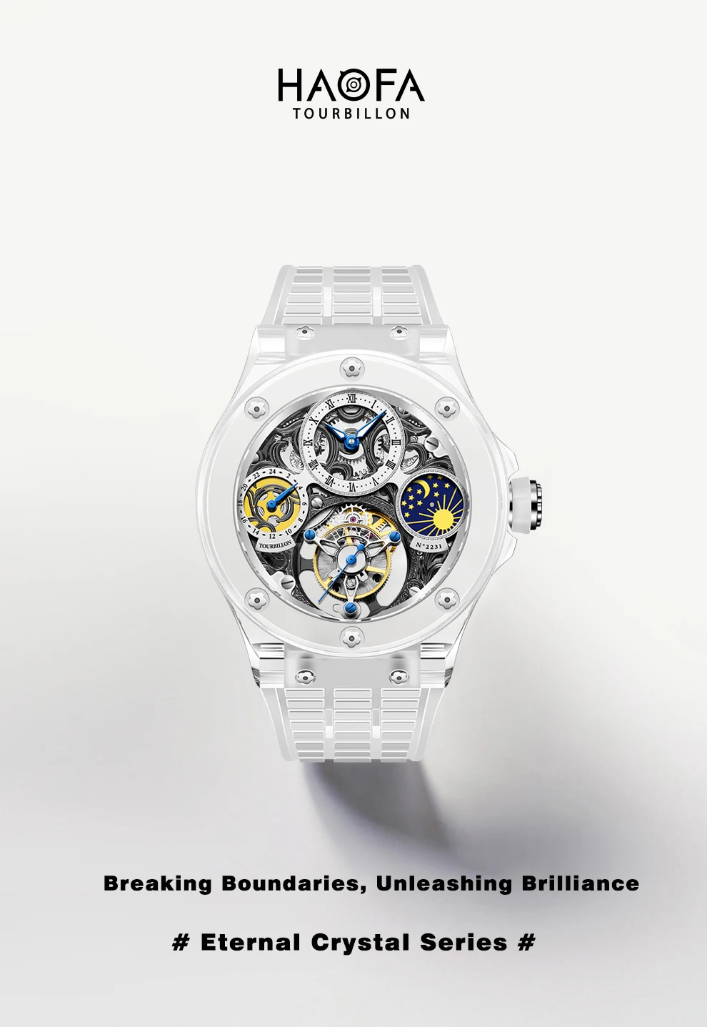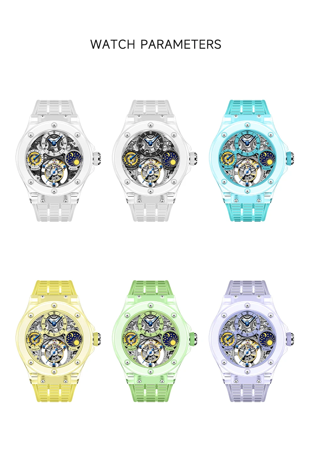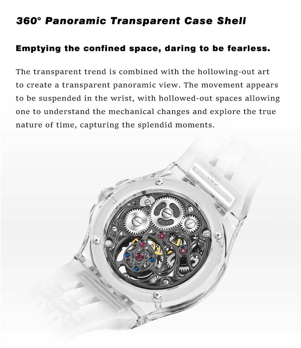 A fusion of transparent trends and skeletonized art, creating a clear, panoramic view. The movement seems to float on your wrist, revealing the mechanical transformations within the skeletonized design, exploring the true nature of time, and capturing memorable moments.